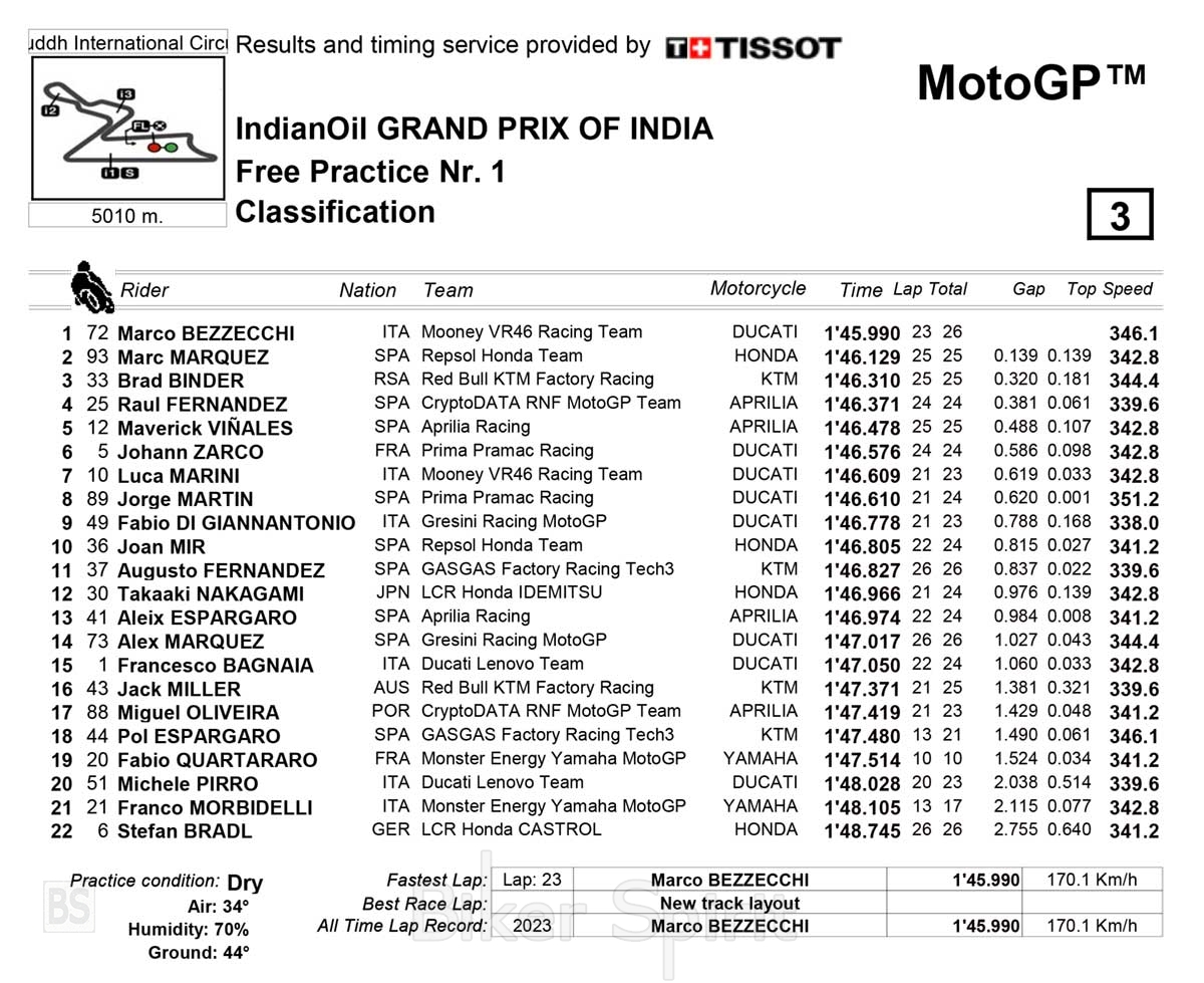 Ο Marco Bezzecchi πέτυχε τον καλύτερο χρόνο στον πρώτο γύρο ελεύθερων δοκιμών του Grand Prix της κατηγορίας MotoGP της Ινδίας, για τον 13ο γύρο του πρωταθλήματος MotoGP 2023 στο Buddh International Circuit.