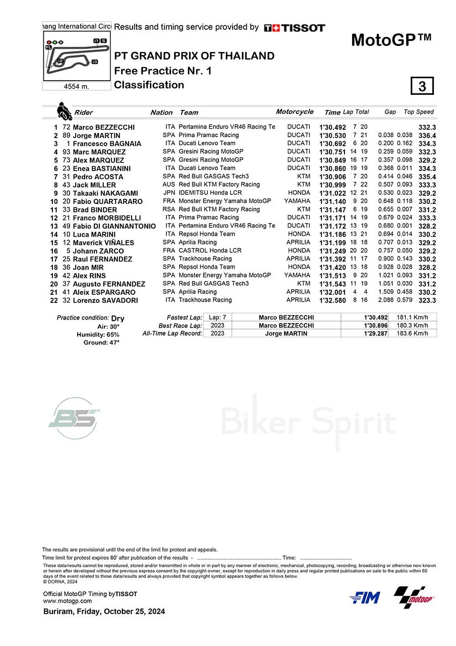 Ο Marco Bezzecchi πέτυχε τον καλύτερο χρόνο στην πρώτη ελεύθερη δοκιμή FP1 του Grand Prix της κατηγορίας MotoGP της Ταϊλάνδης, για τον 18ο γύρο του MotoGP 2024.