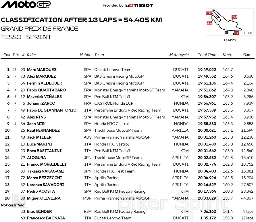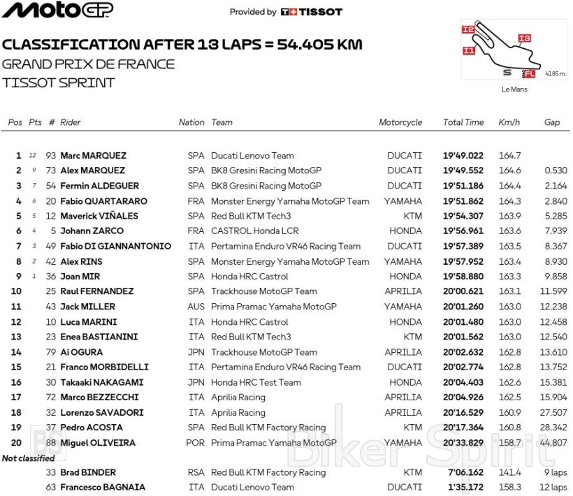 Σε ένα ακόμη Sprint, το έκτο στη σειρά της φετινής περιόδου στην πίστα του Le Mans, ο κορυφαίος Marc Marquez τερμάτισε στην πρώτη θέση μετρώντας την έκτη του συνεχόμενη νίκη του σε αγώνα Sprint, διατηρώντας το τέλειο ρεκόρ νικών στους αγώνες sprint για το 2025 και καθιερώνει νέο ρεκόρ για τις περισσότερες συνεχόμενες νίκες στα sprint: έξι.