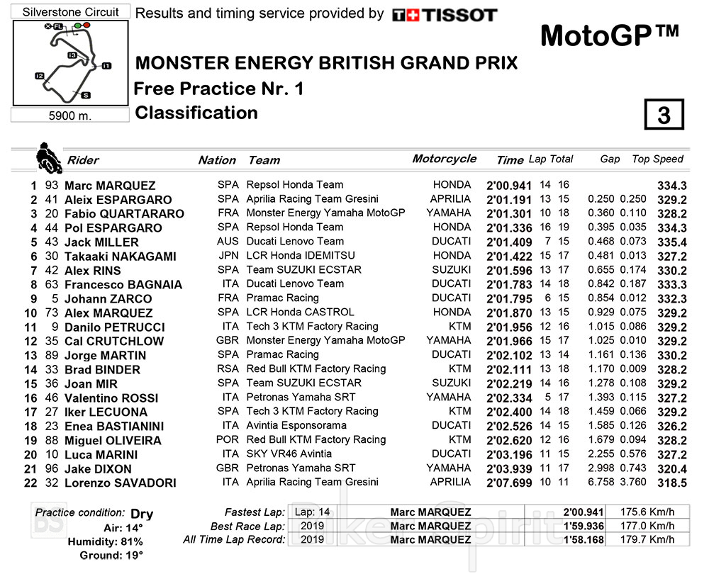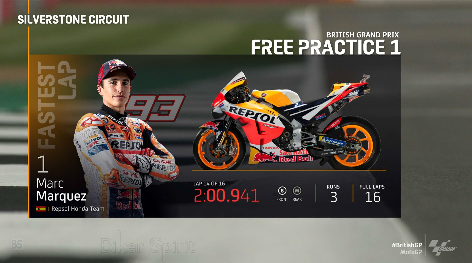 Τον ταχύτερο γύρο της πρώτης ελεύθερης δοκιμής FP1στην Βρετανική κρύα πίστα, έκανε ο Marc Marquez, ο οποίος φαινόταν σε εξαιρετική φόρμα και σταμάτησε το χρονόμετρο στο 2:00.941, ακόμα κι αν στο τέλος της περιόδου ο οκτώ φορές παγκόσμιος πρωταθλητής υπέστη μια σφοδρή πτώση στην στροφή 2, με ταχύτητα 274 χιλιόμετρα την ώρα, με αποτέλεσμα σε αυτό το σημείο της πίστας να περάσει η μηχανή αλλά ακόμα και ο αναβάτης στην πίστα και πάλι, αναγκάζοντας την κόκκινη σημαία να βγει και να διακοπεί το FP1 περίπου 2 λεπτά πριν το τέλος! Ευτυχώς ο Marquez δεν τραυματίστηκε αφού έκανε πάρα πολλές τούμπες σε αυτή την επικίνδυνη πτώση.