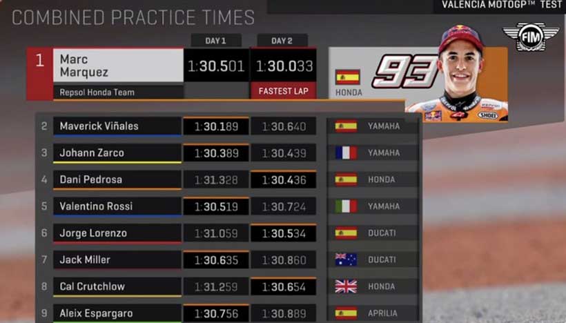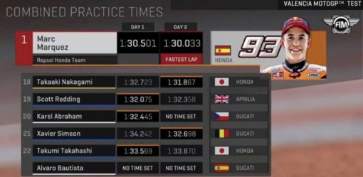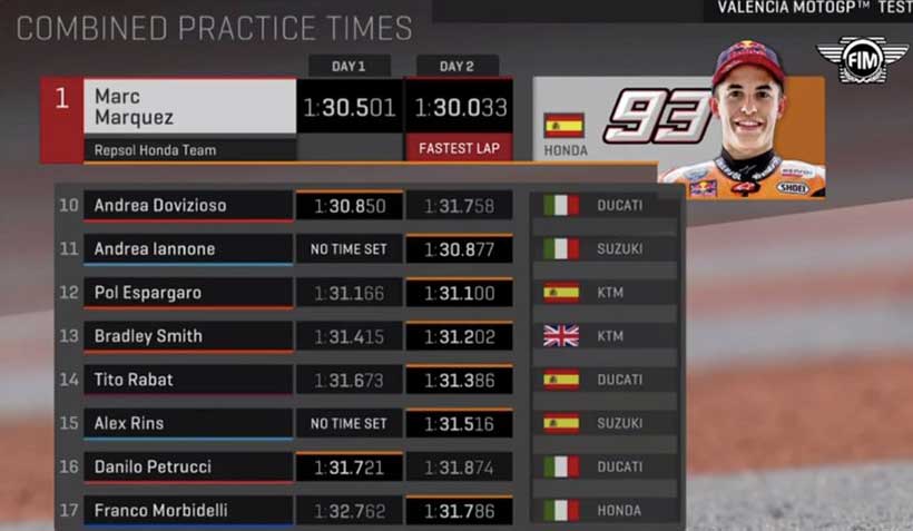 Ο τέσσερις φορές πρωταθλητής MotoGP, Marc Marquez έγραψε τον ταχύτερο γύρο σήμερα δεύτερη μέρα δοκιμών στη Βαλένθια, όπου ήταν και ο ταχύτερος του διημέρου.