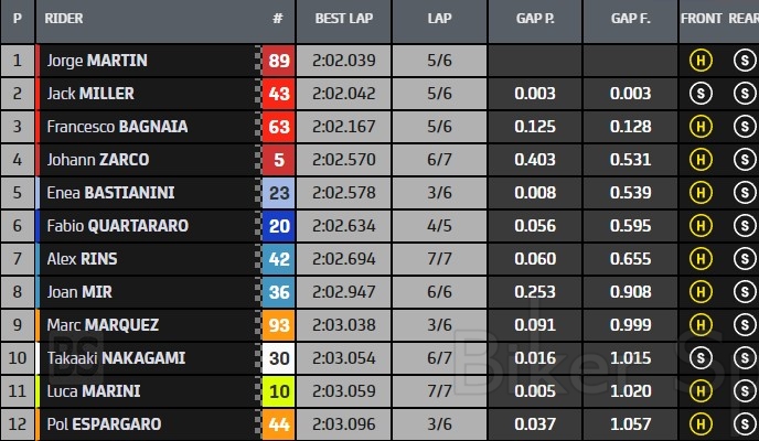 Την πρώτη σειρά στην τρίτη θέση κλείνει ένα ακόμα Ducati αυτό του Pecco Bagnaia με χρόνο 2.02.167.