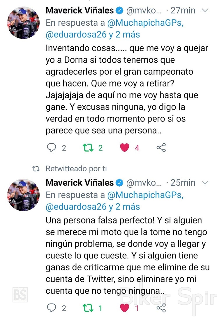 Ο Maverick Viñales δέχθηκε πολλές κριτικές στα κοινωνικά του δίκτυα. Μεταξύ αυτών, για ορισμένες φερόμενες δηλώσεις του αναβάτη στις οποίες «απείλησε την Dorna να αποχωρήσει από το πρωτάθλημα λόγω της ακύρωσης των καλύτερων γύρων του στο Q2 το Σάββατο από την Race Direction». Ο Maverick δεν άφησε αναπάντητες αυτές τις κατηγορίες μέσω του λογαριασμού του στο Twitter.