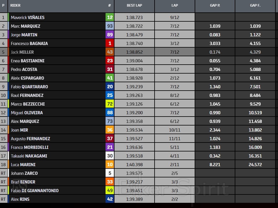 Ο Brad Binder, ο Johann Zarco, ο Fabio di Giannantonio και ο Alex Rins είχαν πτώσεις , ευτυχώς όλοι χωρίς τραυματισμούς.