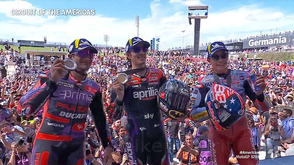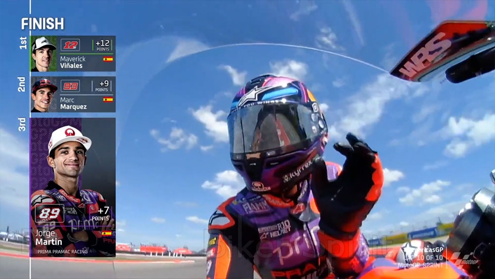 Το βάθρο του αγώνα Sprint έκλεισε ο Jorge Martin που ξεκινώντας από την 6η θέση κατάφερε και έφτασε πίσω από τους τρεις πρώτους γρηγορά και μπόρεσε μετα την επίθεση του Acosta στον Marquez, αν επιτεθεί αυτός στον rookie και να περάσει, αλλα δεν κατάφερε ποτέ να φτάσει το ρυθμό του Marquez και έτσι τερμάτισε με ασφάλεια στην 3η θέση, ανοίγοντας την διαφορά του στην πρώτη θέση της βαθμολογίας!