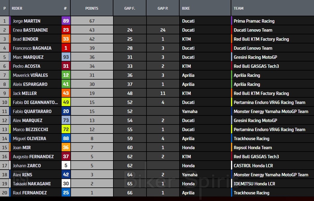 Εν αναμονή του αυριανού αγώνα, ο Martin επεκτείνει το προβάδισμά του στο Πρωτάθλημα, ανεβάζοντας το προβάδισμά του έναντι του Bastianini στους 24 βαθμούς. Ο Brad Binder είναι τρίτος στη βαθμολογία, με 25 βαθμούς πίσω, ενώ ο Bagnaia είναι τέταρτος με 28 βαθμούς διαφορά, ενώ ακριβώς πίσω του με 3 βαθμούς διαφορά είναι ο Marc Marquez στην 5η θέση και ο rookie Pedro Acosta στην 6η με 5 βαθμούς διαφορά!