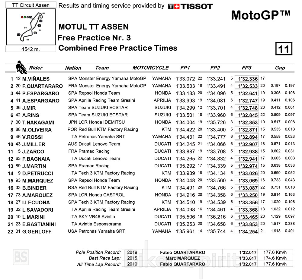 Ο Maverick Vinales συνεχίζει να κυριαρχεί στο Assen και στα τρίτα ελευθέρα δοκιμαστικά, αφού σημείωσε τον ταχύτερο γυρο, σταματώντας το χρονόμετρο στο 1.32.336, που είναι και ο ταχύτερος μέχρι τώρα, και φαίνεται πως έχει φύγει εντελώς από την κατάσταση που ήταν στο Sachsenring.