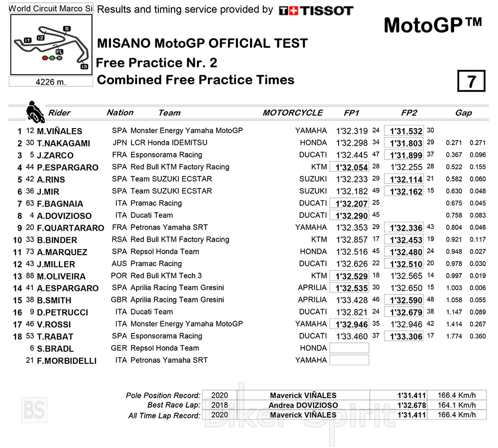 Στην δεύτερη θέση έκλεισε την ημέρα ο Takaaki Nakagami της LCR με χρόνο 1:31.803 και διαφορά μόλις 0,271 δευτερόλεπτα, πίσω από την κορυφή.