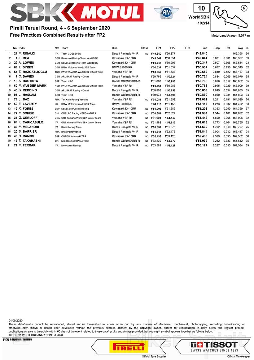 Ο Toprak Razgatlioglu (PATA YAMAHA WorldSBK) τερμάτισε την ημέρα στην πέμπτη θέση, ενώ ο Michael van der Mark (PATA YAMAHA WorldSBK) ήταν στην όγδοη θέση. Ο Razgatlioglu ήταν πίσω περίπου οκτώ δέκατα από το ρυθμό του Rinaldi.