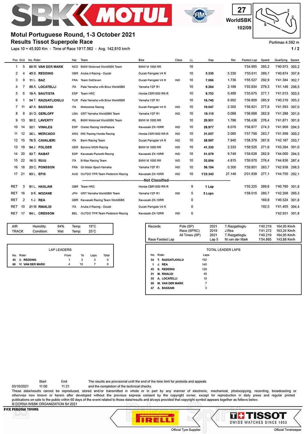 Μια μακρά αναμονή 2.994 ημερών έχει τελειώσει για τη BMW αφού ο Michael van der Mark (BMW Motorrad WorldSBK Team) κέρδισε την πρώτη νίκη του Γερμανού κατασκευαστή μετά το Nürburgring το 2013 στον αγώνα SUPERPOLE, με τον Ολλανδό αναβάτη να χειρίζεται τις δύσκολες συνθήκες στο Algarve με τον καλύτερο τρόπο και αποτελεσματικά, ενώ ο Jonathan Rea (Kawasaki Racing Team WorldSBK) έπεσε ενώ είχε το προβάδισμα για δεύτερο συνεχόμενο αγώνα.