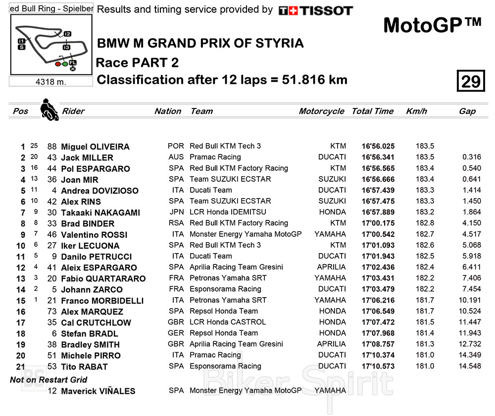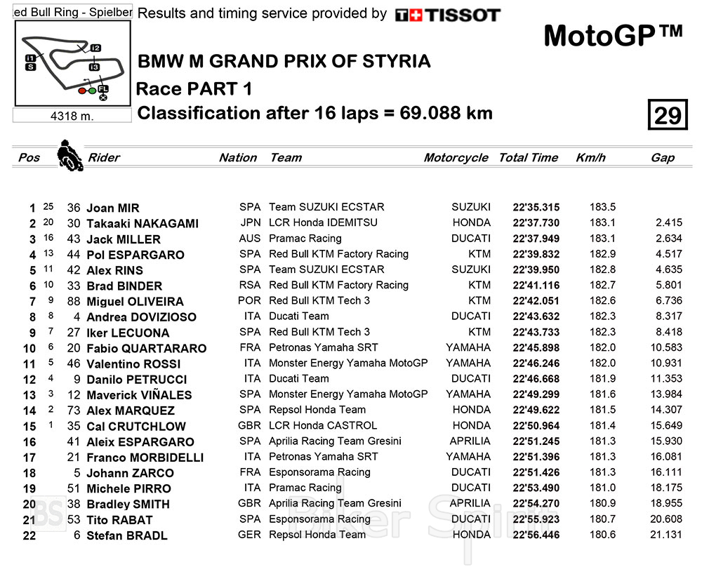 Ο αγώνας ξεκίνησε με τον Pol Espargaro στην Pole position, αλλά ο Mir έκανε μια φοβερή εκκίνηση και οδήγησε τον αγώνα μέχρι την διακοπή του με κόκκινη σημαία όταν ο Maverick Vinales αναγκάστηκε να πηδήξει από την μηχανη του στο τέλος της ευθείας όταν διαπίστωσε πως δεν είχε φρένα. Η μηχανη έσκασε στο φράγμα με 200+ χλμ και έπιασε φωτιά με αποτέλεσμα να διακοπεί ο αγώνας. Ο Vinales σίγουρα θα θέλει να φύγει από την Αυστρία και να ξεχάσει αυτές τις δυο οδυνηρές βδομάδες!