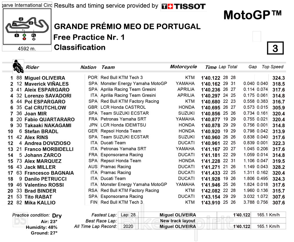 Στην κατάταξη του FP1, ο Pol Espargarò τέλειωσε στην πέμπτη θέση με το KTM, μπροστά από τη Honda της ομάδας LCR του Cal Crutchlow και τη Suzuki του παγκόσμιου πρωταθλητή 2020 Joan Mir.