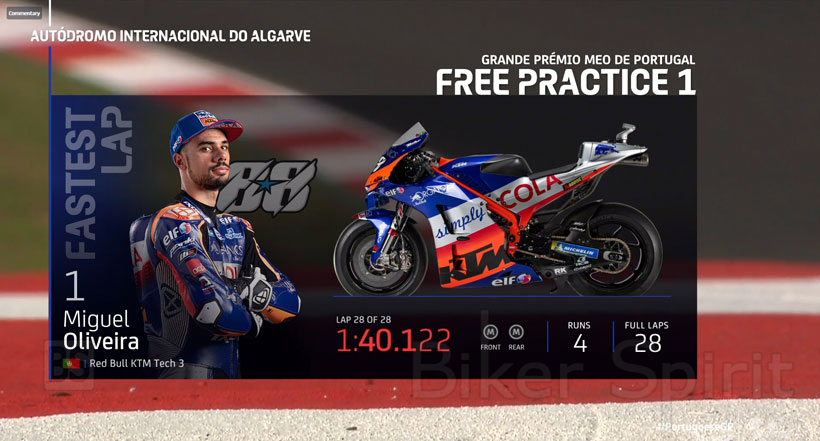 Ο Miguel Oliveira, o Πορτογάλος αναβάτηw της δορυφορικής Team KTM Tech 3 ήταν ο ταχύτερος στο FP1 του Portimao, με χρόνο 1.40.122 που έκανε στον τελευταίο του γυρο, ενώ σε όλη την διάρκεια του FP1 ήταν συνεχώς στις κορυφαίες θέσεις!