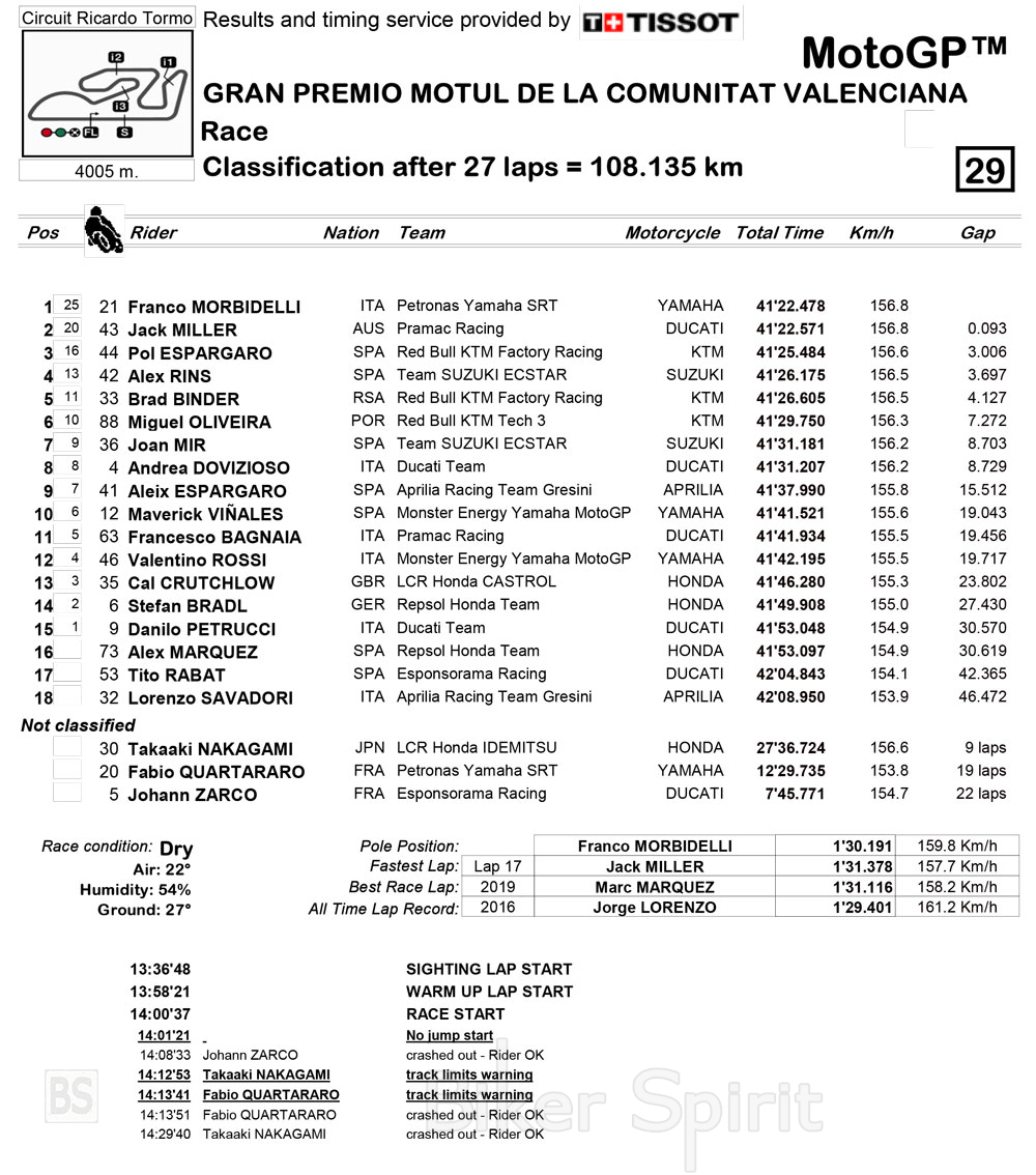 Στην 11η θέση τερμάτισε ο Pecco Bagnaia, μπροστά από τον Valentino Rossi, τον Cal Crutchlow, τον Stefan Bradl, τον Danilo Petrucci και τον Alex Marquez που αγνίζοντας τραυματισμένος μετα την χθεσινή του σφοδρή πτώση!