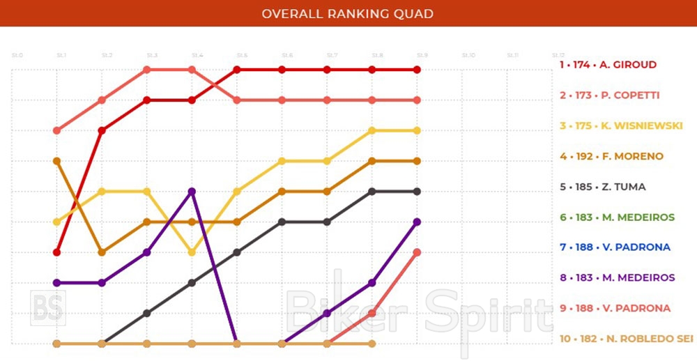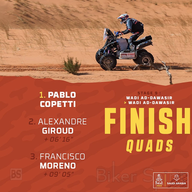 Ο Sam Sunderland (GASGAS), νικητής της 8ης ειδικής, τερμάτισε στην 14η θέση με διαφορά + 00H 08′ 03” από τον πρώτο, πληρώνοντας, για άλλη μια φορά, ότι ανοίξει την ειδική. Πάρα πολύ μεγάλο κενό για το πόσο σφιχτές ήταν οι πρώτες θέσεις. Στην πραγματικότητα, του κόστισε το προβάδισμα της γενικής, το οποίο πλέον έχει ο Matthias Walkner (KTM), ο οποίος τερμάτισε 4ος σήμερα και τώρα προηγείται της γενικής βαθμολογίας χωρίς ποτέ να έχει πετύχει μια νίκη ειδικής φέτος.