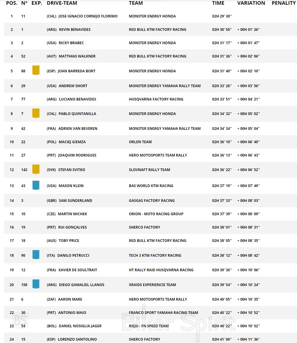 Ο Kevin Benavides (KTM) τερμάτισε δεύτερος με διαφορά 2:07, μπροστά από τον Brabec (Honda) που ολοκληρώνει το «βάθρο» της ημέρας με διαφορά στο 1:47.