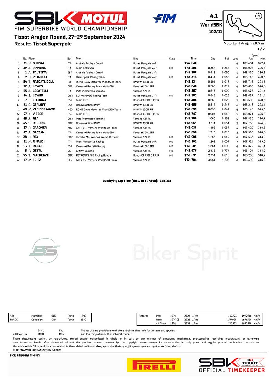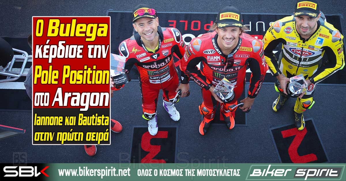 Ο Nicolo Bulega (Aruba.it Racing – Ducati) εξασφάλισε την δεύτερη pole του στο Παγκόσμιο Πρωτάθλημα Superbike. Ο Bulega έκανε νέο ρεκόρ γύρου με χρόνο 1’47.840s που του έδωσε την pole position στο grid μπροστά από τον Andrea Iannone (Team GoEleven) και τον Alvaro Bautista που ολοκλήρωσε την πρώτη σειρά στο MotorLand Aragon.