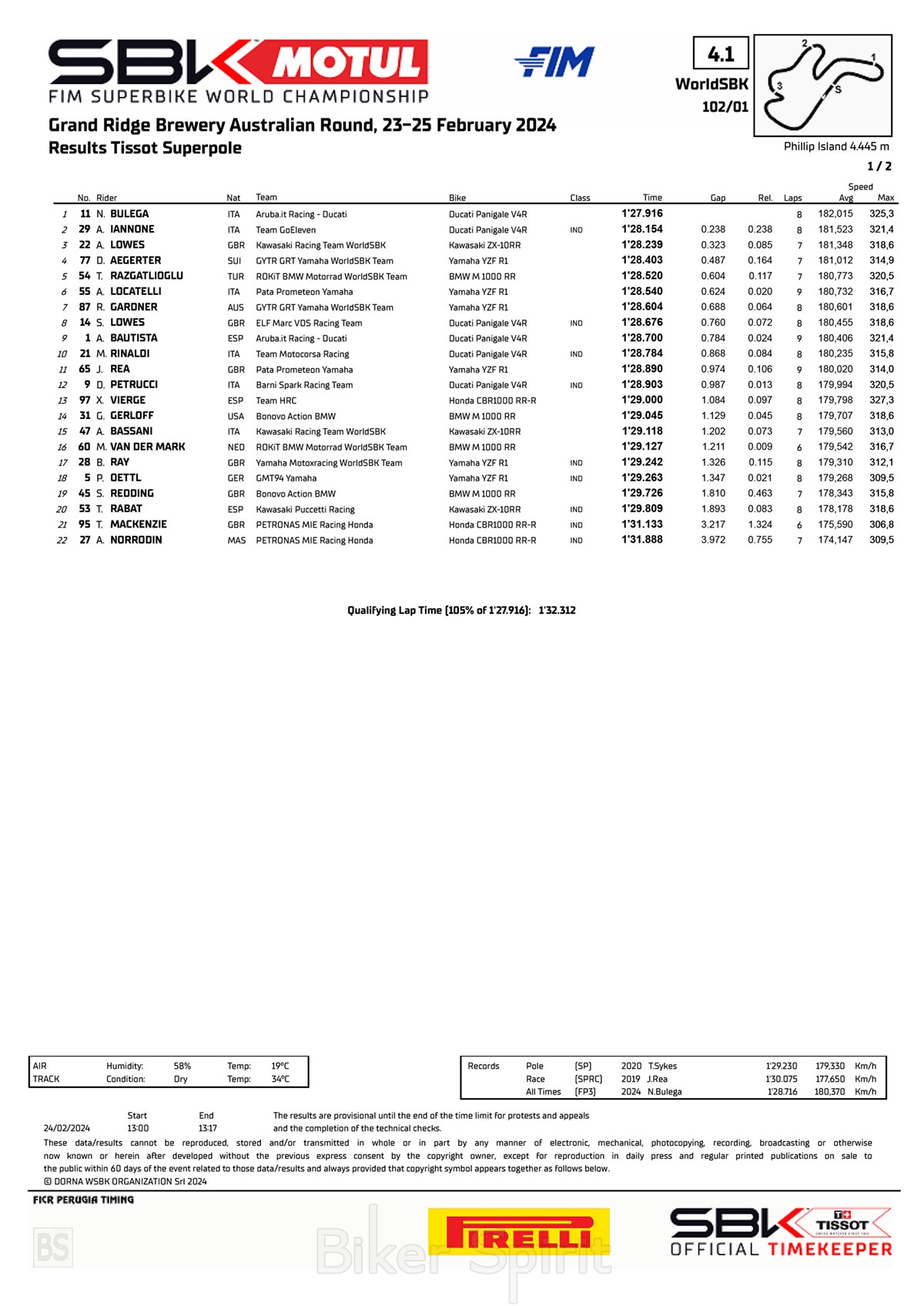 Ο εκπληκτικός rookie Nicolo Bulega (Aruba.it Racing – Ducati) έγραψε ιστορία σήμερα στην Αυστραλία, σταματώντας το χρονόμετρο στο 1.27.916s που είναι νέο απολυτό ρεκόρ, διαλύοντας στην κυριολεξία το προηγούμενο ρεκόρ της pole του Tom Sykes που ήταν 1:29.230, από το 2020 ! και μιλάμε για ένα χρόνο που πλησιάζει το απολυτό ρεκόρ του MotoGP που είναι 1.27.246s! Ο Nicolo Bulega ήταν ο μονός αναβάτης που κατέβηκε στο 1.27s