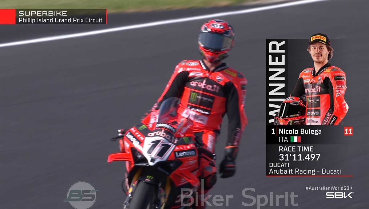 Ο Nicolo BULEGA, με το Ducati Panigale V4R ξεκίνησε από την Pole position και έμεινε μπροστά σε όλη την διάρκεια του αγώνα, κάνοντας μια διαφορά από τον 2ο που κάποια στιγμή ξεπέρασέ και τα 6.5 δευτερόλεπτα, ενώ πέρασε την γραμμή τερματισμού με διαφορά +4.811 από τον 2ο, κάνοντας την πρώτη νίκη της σεζόν, σε μια πίστα όπου και πέρυσι είχε κερδίσει και τους δυο αγώνες!