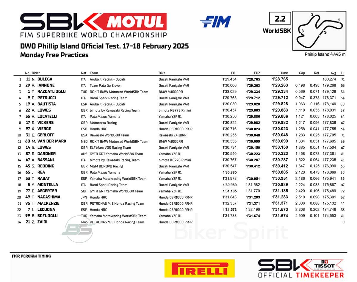 Ο Nicolo Bulega έγραψε τον ταχύτερο γύρο της ημέρας 1με χρόνο 1:28,765, μπροστά από τον Andrea Iannone που έγραψε 1:29,263 και τον Toprak Razgatlioglu με την BMW που σταμάτησε το χρονόμετρο στο 1:29,334 και με διαφορά + 0,569 από την κορυφη έκλεισε την πρώτη τριάδα της ημέρας!