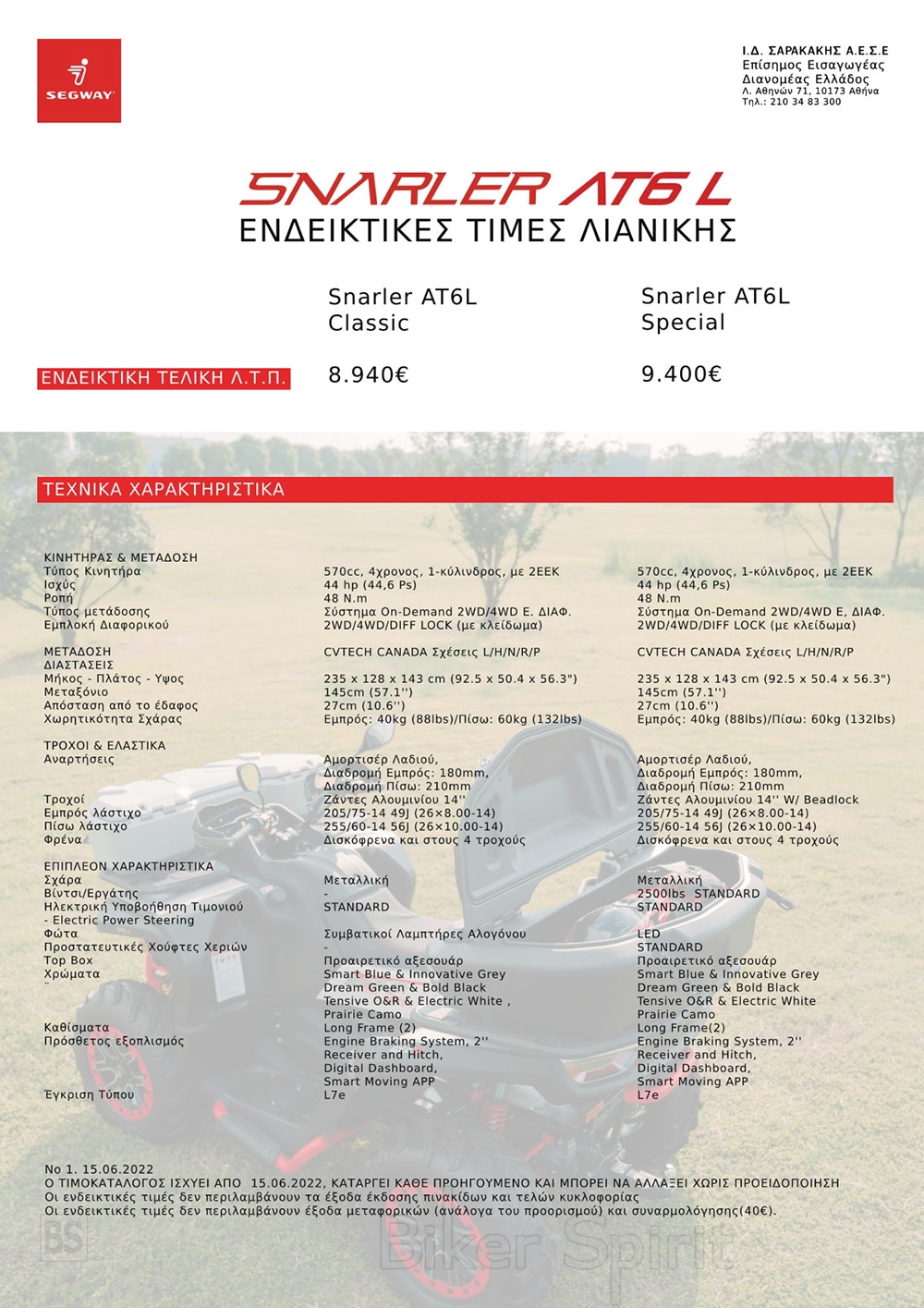 Το All–Terrain Vehicle (ATV) SNARLER AT6 L είναι το πρώτο μοντέλο της Segway Powersports που διατίθεται ήδη στην ελληνική αγορά σε δύο εκδόσεις, την Classic (Λ.Τ. 8.940€) και την Special (Λ.Τ. 9.400€).