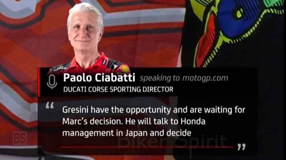 Τα λόγια του Ciabatti είναι πολύ σημαντικά αφού είναι η πρώτη φορά που κάποιος στη Ducati ή στην Gresini αναγνωρίζει ακόμη και την πιθανότητα ο Marc Marquez να κάνει το τεράστιο βήμα για να ενταχθεί στη δορυφορική ομάδα της Ducati.