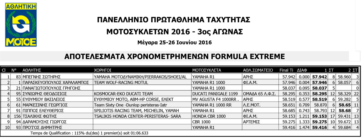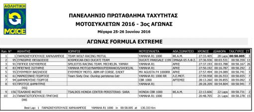 Κάτω από τον καυτό Ήλιο έγινε ο 3ος αγώνας του Πανελληνίου Πρωταθλήματος Ταχύτητας 2016, στην μεγάλη κατηγορία (Formula Extreme), όπου όπως πάντα είχε στραμμένα όλα τα βλέμματα πάνω της , αφού η σχάρα εκκίνησης ήταν διαφορετική από κάθε άλλο αγώνα φέτος.