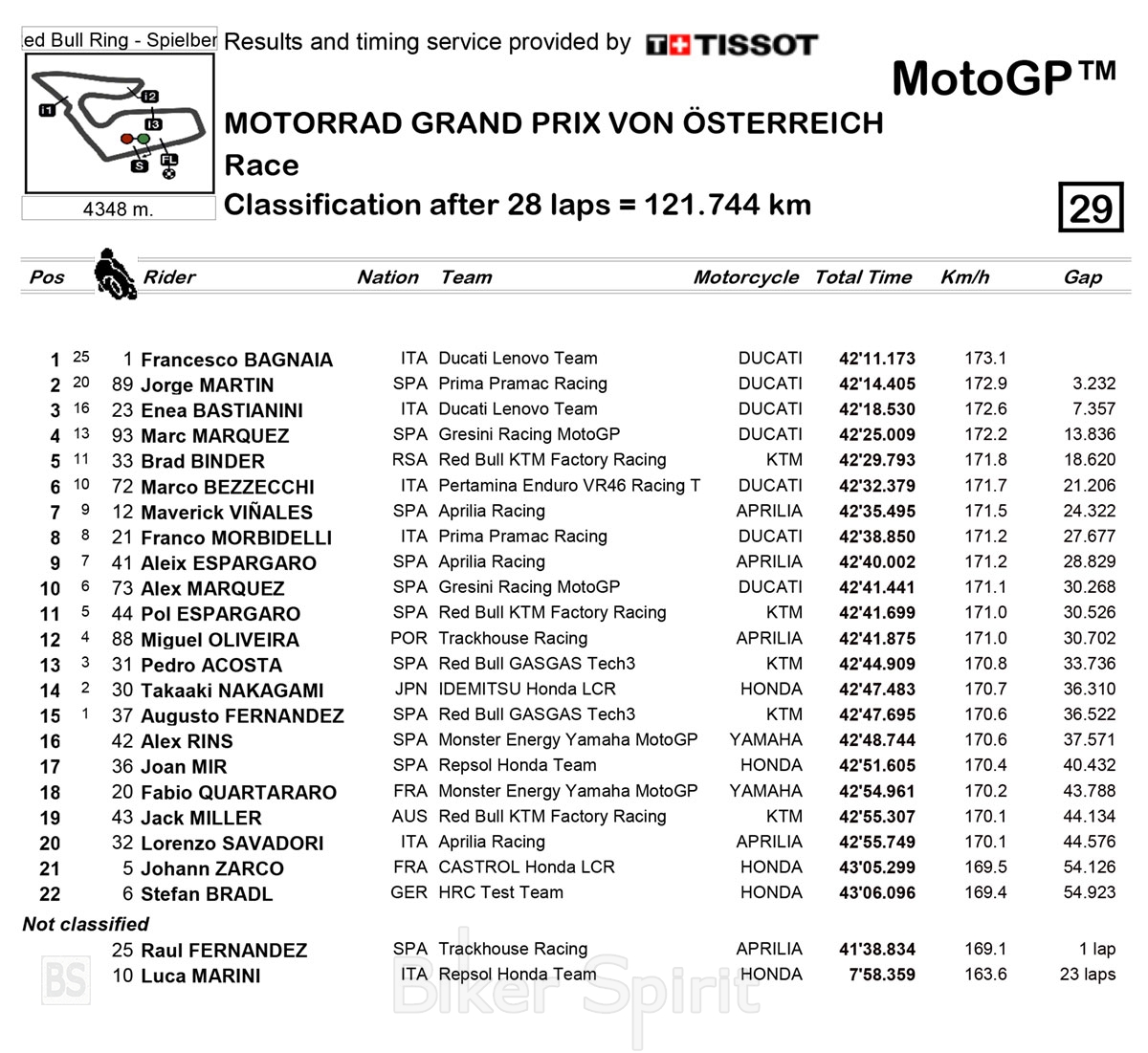 Ο Pecco Bagnaia όπως και στον αγώνα Sprint έδωσε μια μικρή μάχη με τον Martin στους πρώτους γύρους, μέχρι να περάσει στην κορυφη και να φτάσει άνετα στην καρό σημαία, χωρίς προβλήματα και κινδύνους με ένα φοβερό ρυθμό, κάνοντας την 7η νίκη του για φέτος, που τον φέρνει με 5 βαθμούς διαφορά στην κορυφη της βαθμολογίας! Για τον Bagnaia αυτή ήταν η 25η νίκη στην μεγάλη κατηγορία και η 35η στην καριέρα του.