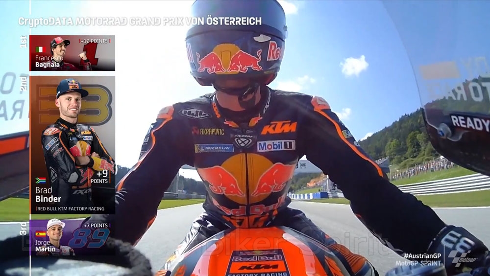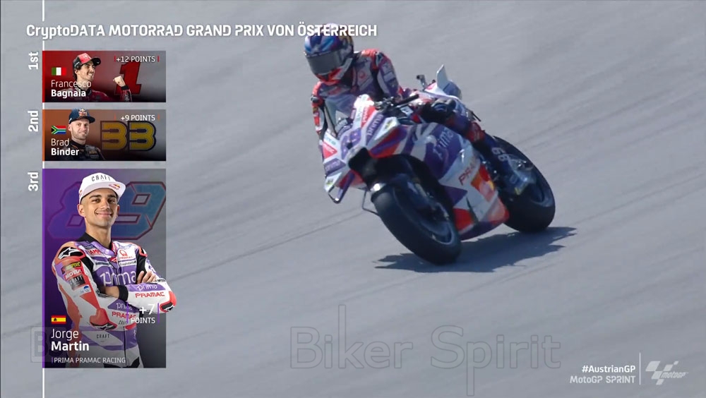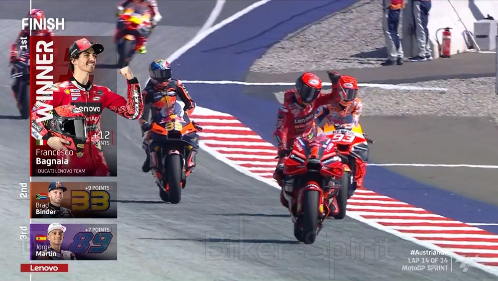 Στο Πρωτάθλημα ο Bagnaia φτάνει τους 226 βαθμούς, 46 περισσότερους από τον Jorge Martin και 59 περισσότερους από τον Marco Bezzecchi. Ο Binder είναι τέταρτος, 86 βαθμούς πίσω.