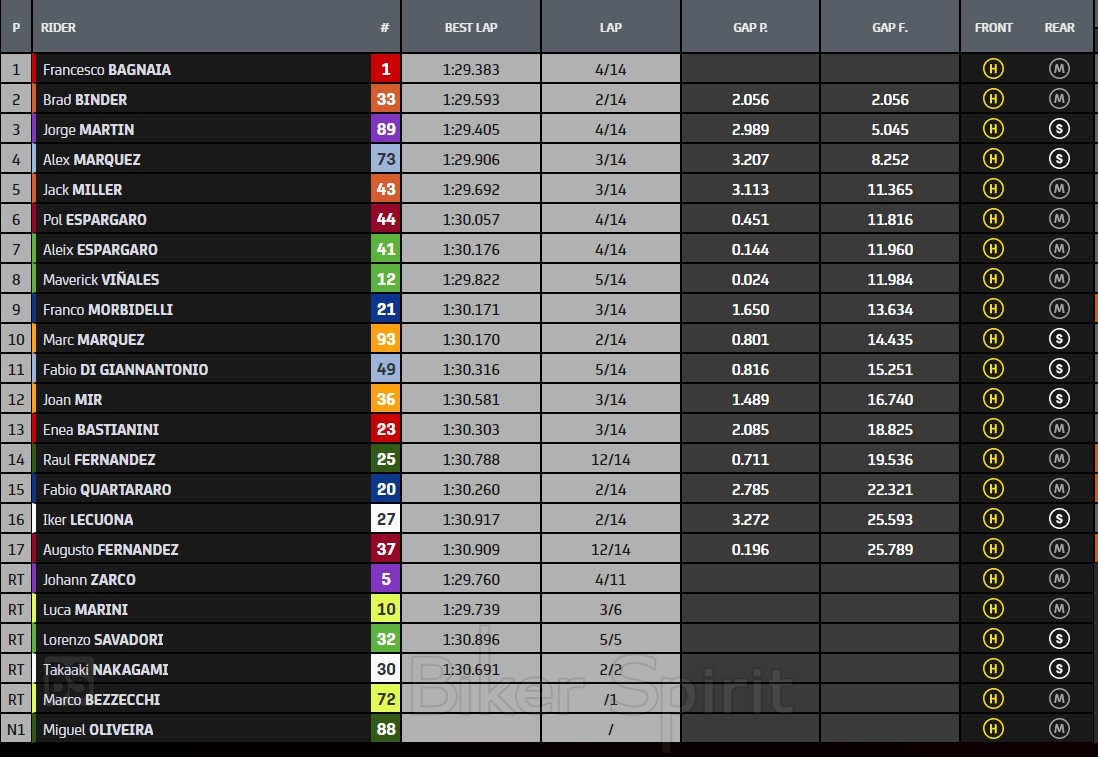 Ο αναβάτης της Ducati που ξεκίνησε από την pole position κυριάρχησε περνώντας τη γραμμή τερματισμού με διαφορά πάνω από 2 δευτερόλεπτα από το KTM του Brad Binder, που στους πρώτους γύρους φάνηκε να κυνηγά τον Bagnaia αλλα τελικά δεν κατάφερε να τον πλησιάσει και να τον απειλήσει !
