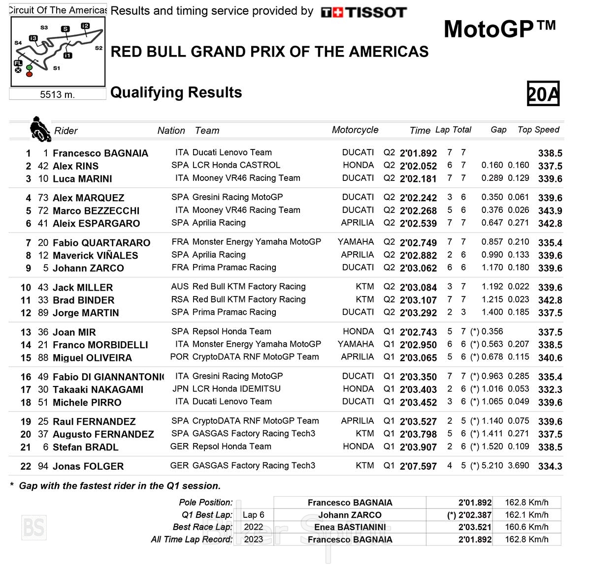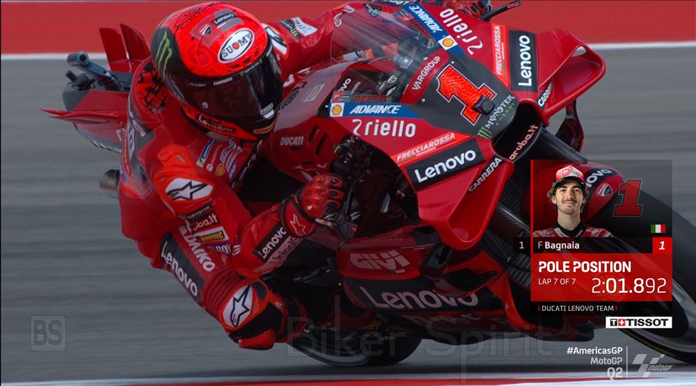 Ο Pecco Bagnaia (Ducati) κέρδισε την pole position με νέο ρεκόρ στην Αμερική, σταματώντας το χρονόμετρο στο 2.01.892 και έγινε ο πρώτος αναβάτης που κατέβασε τον χρόνο στο 2.01s