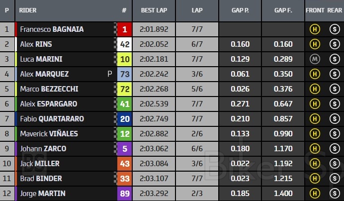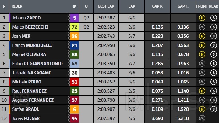 Την δεύτερη σειρά ανοίγουν δυο ακόμα Ducati με τους Alex Marquez (Gresini Ducati) που είχε πτώση στο τέλος της συνεδρίας και Marco Bezzecchi (VR46 Ducati) που πέρασε από την διαδικασία του Q1, ενώ την κορυφαία εξάδα κλείνει το πρώτο Aprilia με τον Aleix Espargaro (Aprilia).