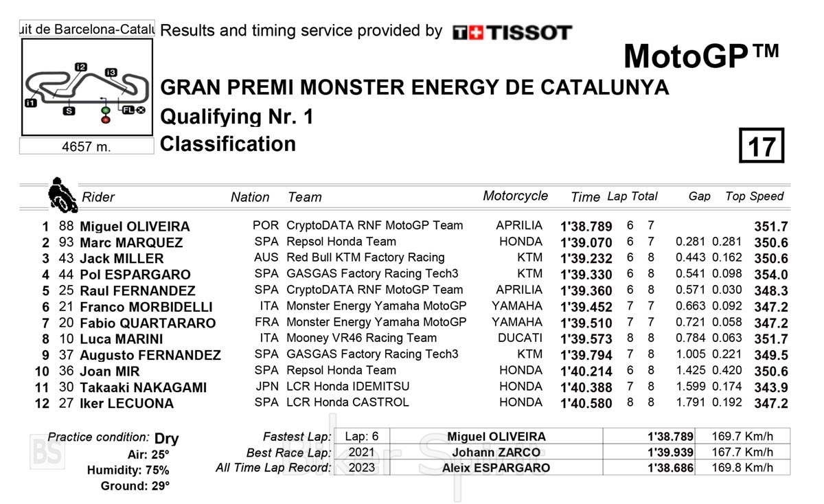 Στην πρώτη σειρά μαζί του δύο Aprilia, η επίσημη Aprilia του Aleix Espargarò, που χωρίζονται με 0,104 δευτερόλεπτα και η δορυφορική του Miguel Oliveira, με τον Πορτογάλο μόλις 5 χιλιοστά πίσω από τον Ισπανό, με τον Oliveria να γραφεί αυτό το χρόνο προσπερνώντας τον Marc Marquez στον γρήγορο γύρο!