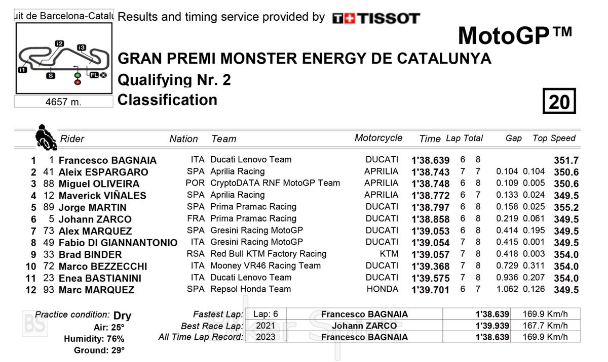 Ο Bagnaia έγραψε χρόνο 1:38.639, που είναι και το νέο ρεκόρ της Καταλανικής πίστας, μια πίστα όπου ο “Pecco” δεν έχει πάρει ποτέ ένα πολύ καλό αποτέλεσμα. Αυτή είναι η 17η pole στην Top Class για τον κυρίαρχο πρωταθλητή, η 24η στην καριέρα του και η 6η του 2023.