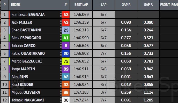 Στην πρώτη σειρά από την δεύτερη θέση θα εκκινήσει ο ομόστυαλός του Jack Miller που έγραψε χρόνο 1:46.159, μπροστά από μια τρίτη Ducati με τον Enea Bastianini που κλείνει την πρώτη σειρά.
