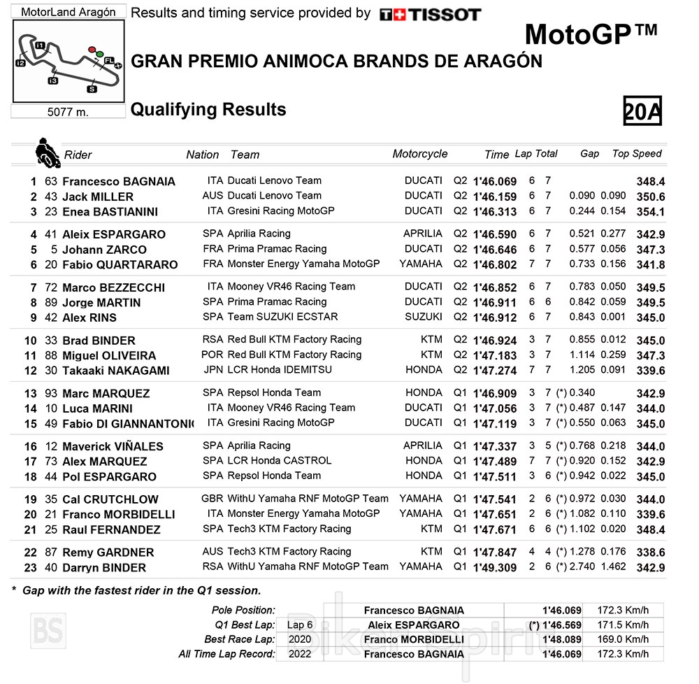 Ο Pecco Bagnaia κατέρριψε το ρεκόρ του Aragon για να πάρει την pole position στο MotoGP. Ήταν ένα νέο φεστιβάλ της Ducati. Ο Aleix, μπροστά από τον Quartararo. Ο Marc Márquez θα πρέπει να επιστρέψει από την 13η θέση.