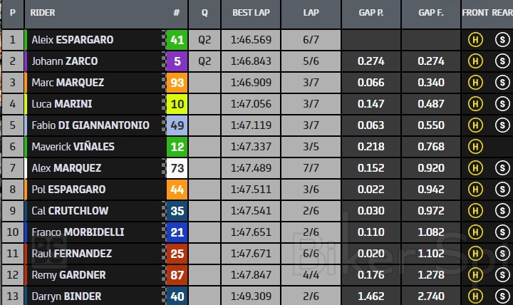 Ο οδηγός της ομάδας Aprilia, Aleix Espargaro θα ανοίξει τη δεύτερη σειρά και μετα που πέρασε από το Q1 έγραψε χρόνο 1:46.590 στο Q2, που τον έφερε στην 4η θέση, μπροστά από τον οδηγό της Ducati Pramac, Johann Zarco και τον επικεφαλής της βαθμολογίας, Fabio Quartararo με την πρώτη Yamaha.