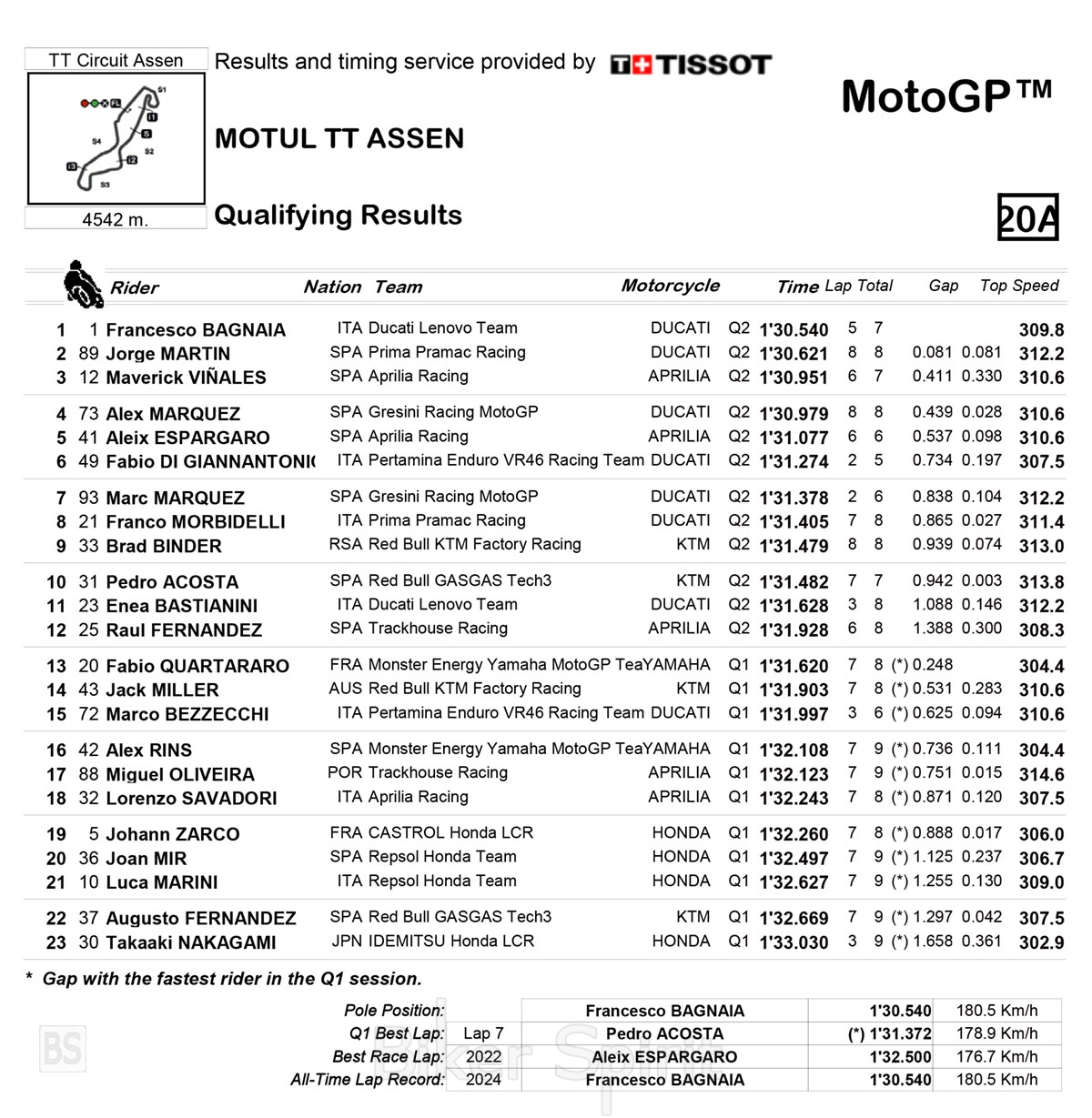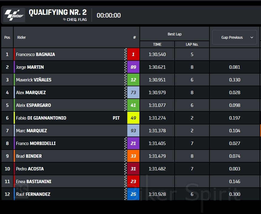 Συντρίβοντας το χρονόμετρο το σταμάτησε στο 1.30.540, έναν εκπληκτικό χρόνο που του χάρισε την πρώτη pole position για φέτος, η 19η pole στο MotoGP, 26η στην καριέρα του. Η τελευταία pole ηταν πριν από 231 ημέρες, στην Μαλαισία το 2023.