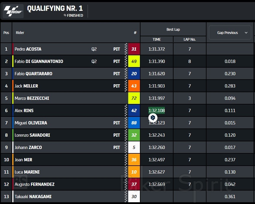 Από την 10η θέση ανοίγοντας την 4η σειρά θα ξεκινήσει τον αγώνα ο Pedro Acosta που πέρασε από το Q1, μπροστά από τον Enea Bastianini και τον Raul Fernandez με την δορυφορική Aprilia!
