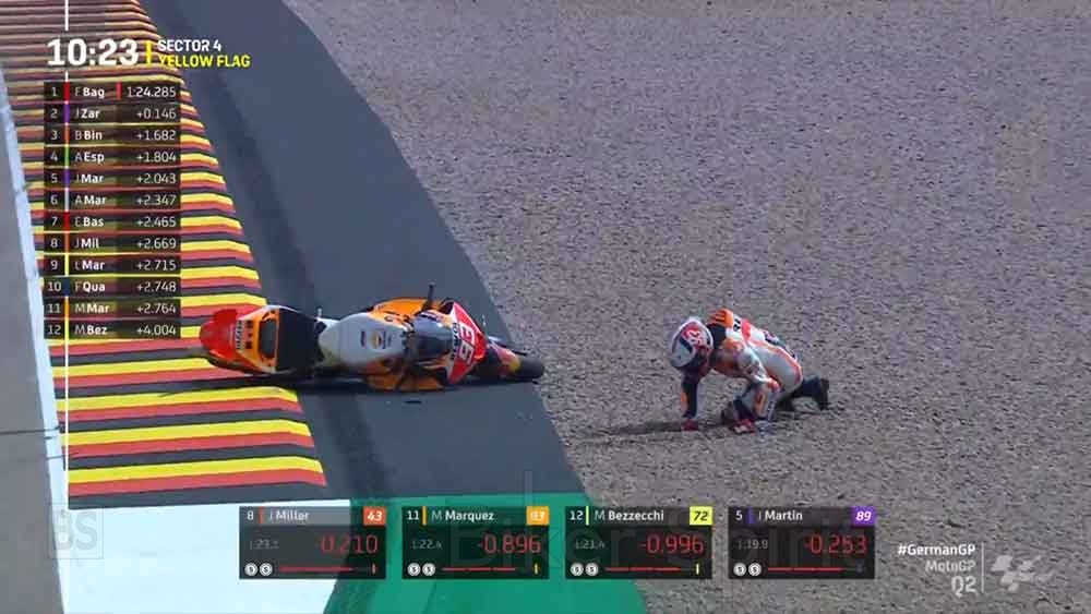 🔥 @PeccoBagnaia retakes the top spot!@JohannZarco1 takes a tumble and so does @marcmarquez93 at last! #GermanGP 🇩🇪 pic.twitter.com/Pu9QWCaomG