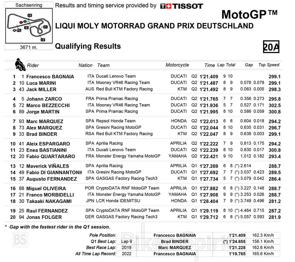 Από την 8η θέση θα εκκινήσει ο Alex Marquez, μπροστά από τον Brand Binder που πέρασε και αυτός από το Q1, κλείνοντας την 3η σειρά.