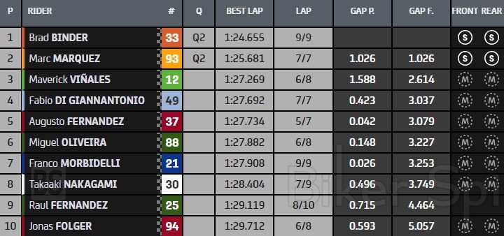 Από την δεύτερη σειρά και την 4η θέση θα ξεκινήσει ο Johann Zarco που είχε πτώση στα τελευταία λεπτά, ευτυχώς χωρίς τραυματισμό, μπροστά από τον Marco Bezzecchi, όπου και αυτός είχε μια πτώση στην τελευταία στροφή στο σημείο οπού έπεσε και ο Marquez, λίγο πριν από αυτόν!