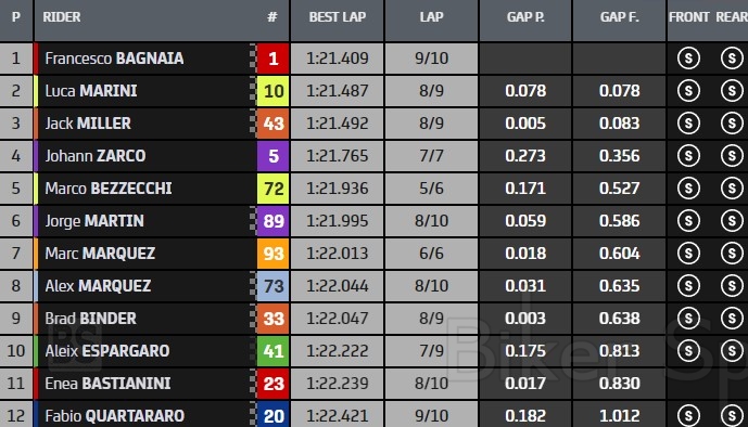 Την τέταρτη σειρά ανοίγει στην 10η θέση το πρώτο Aprilia με τον Aleix Espargaro, ,μπροστά από τον Enea Bastianini και το πρώτο Yamaha με τον Fabio Quartararo.