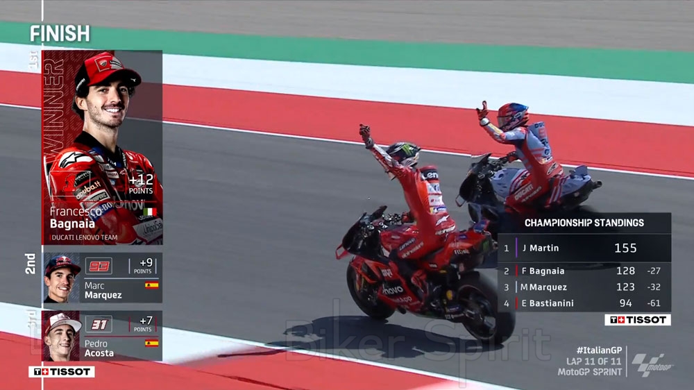 Ο Marc Márquez, δεύτερος και ο Acosta, τρίτος. Ο Μαρτίν έπεσε και είναι πλέον «μόνο» με 27 βαθμούς διαφορά πρώτος μπροστά από τον Bagnaia και 32 μπροστά από τον Marc Marquez.