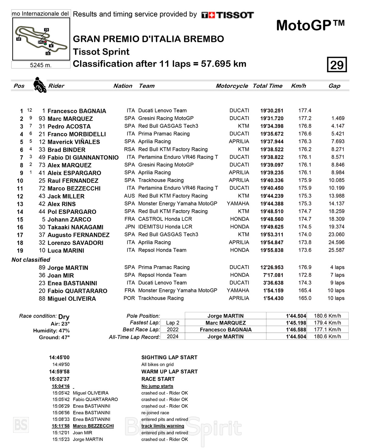 Ο Miguel Oliveira και ο Fabio Quartararo έπεσαν επίσης, με τον Πορτογάλο να χάνει το μπροστινό μέρος του Aprilia RS-GP 24 του, με αποτέλεσμα να παρασύρει τον Γάλλο, ενώ ο Joan Mir αποσύρθηκε.