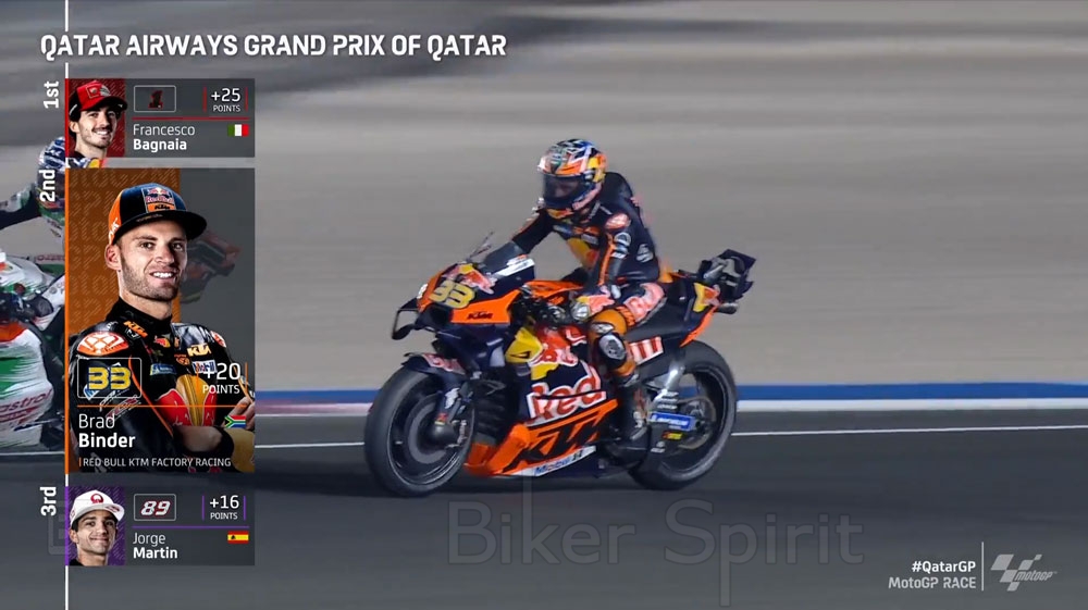 Το βάθρο έκλεισε ο Jorge Martin που δεν κατάφερε να εκμεταλλευτεί την pole position όπως έκανε εχθές στον αγώνα Sprint και δεν μπόρεσε να απαντήσει τους στον Bagnaia αλλα ούτε και στον Binder, και έτσι αρκέστηκε στην τρίτη θέση του βάθρου.