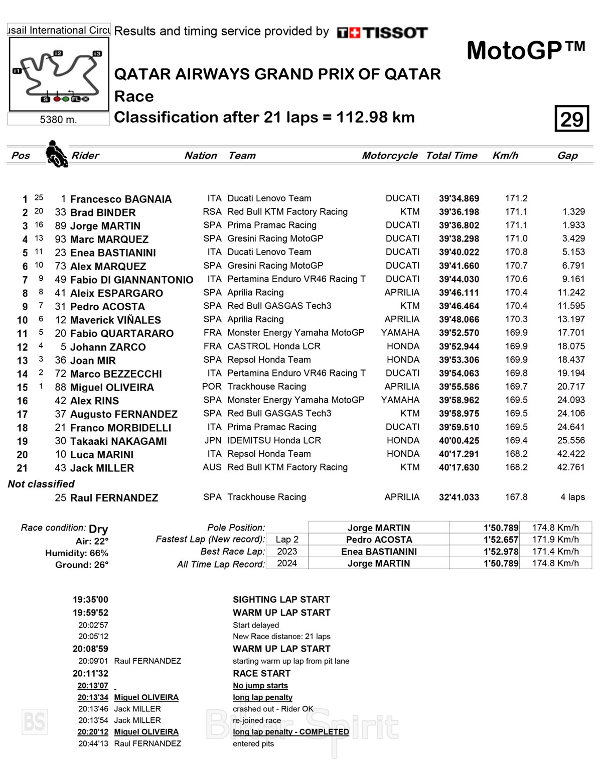 Την 15αδα που παίρνει βαθμούς έκλεισαν στην 14η θέση ο Marco Bezzecchi, μπροστά από τον Miguel Oliveira οπού είχε και ποινή μεγάλου γύρου!