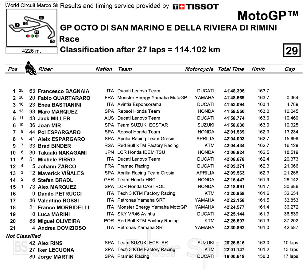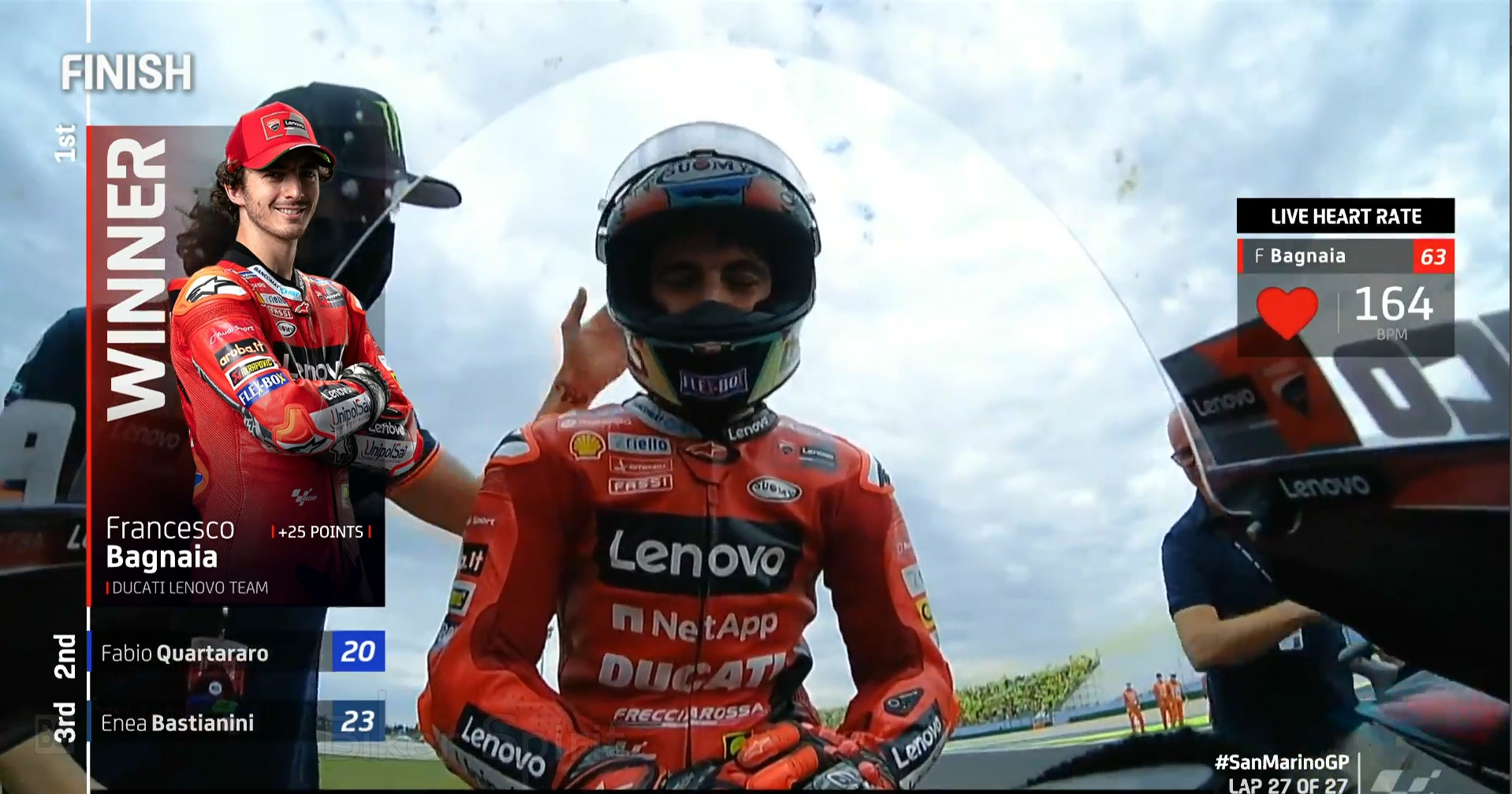 O Bagnaia κέρδισε τον αγώνα στο Misano κάνοντας την δεύτερη συνεχομένη νίκη του στο MotoGP, ενώ κατάφερε και νίκησε ξεκινώντας από την pole στο Misano κάτι που είχε να κάνει αναβάτης της Ducati από το 2007 με τον Stoner.