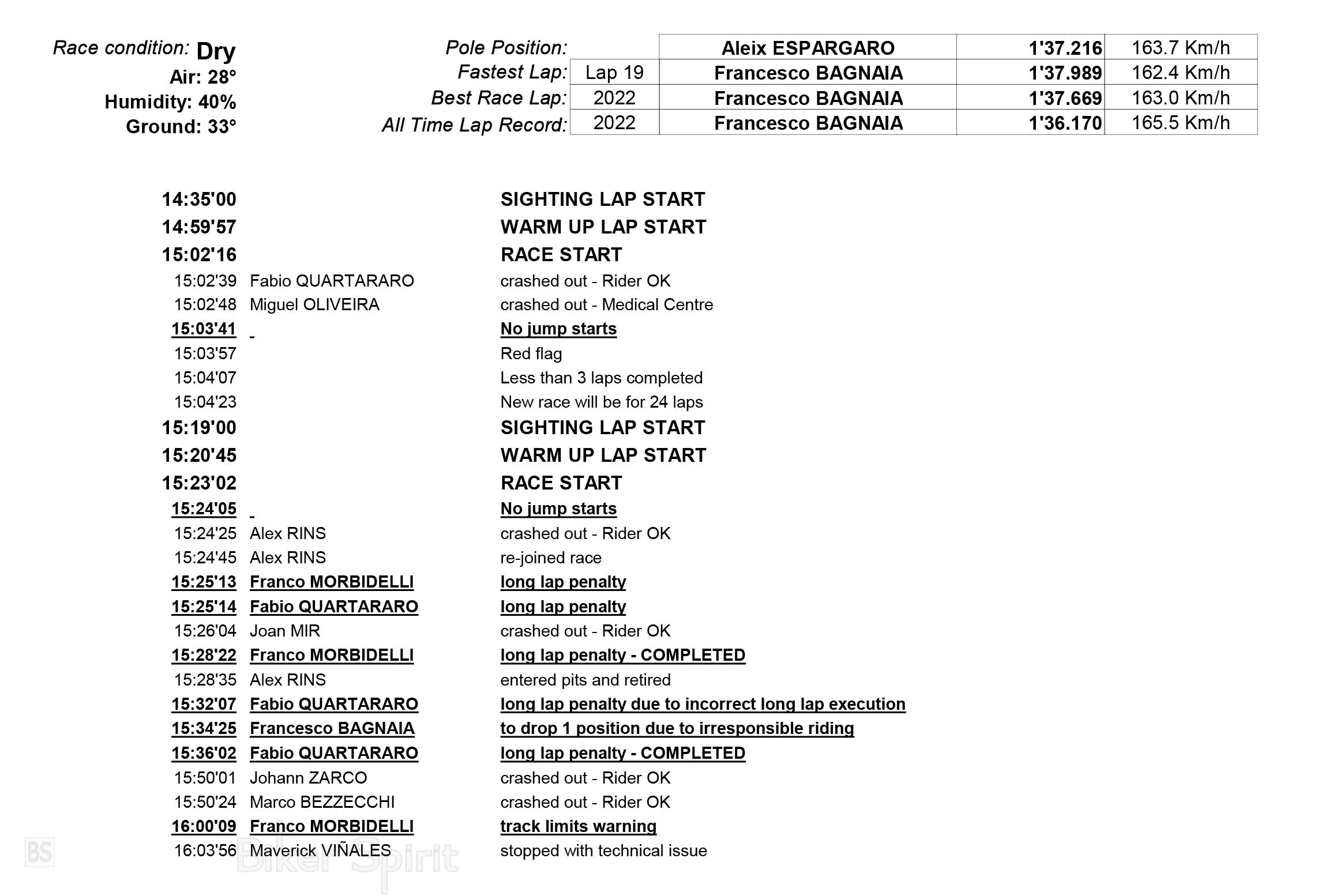 Την παράσταση έκλεψαν και πάλι οι αγωνοδίκες που τιμώρησαν τον Quartararo με μεγάλο γύρο σαν υπεύθυνο για την πτώση. Απόφαση που είναι για γέλια και για κλάματα που έβγαλαν σε χρόνο μηδέν πριν ακόμα την επανεκκίνηση του αγώνα! Πραγματικά οι αγωνοδίκες του MotoGP είναι τραγελαφικοί και όσο προχωρούσε ο αγώνας το κάνανε ακόμα χειρότερο φτάνοντας την τραγικότητα τους στα κόκκινα, αφού τιμώρησαν με 2ο μεγάλο γύρο γιατί λένε δεν εκτέλεσε σωστά τον πρώτο.