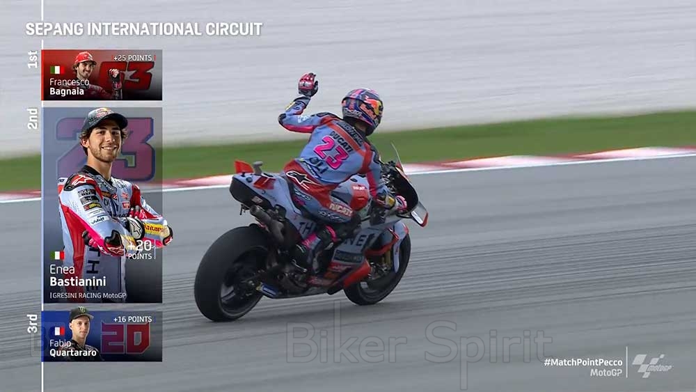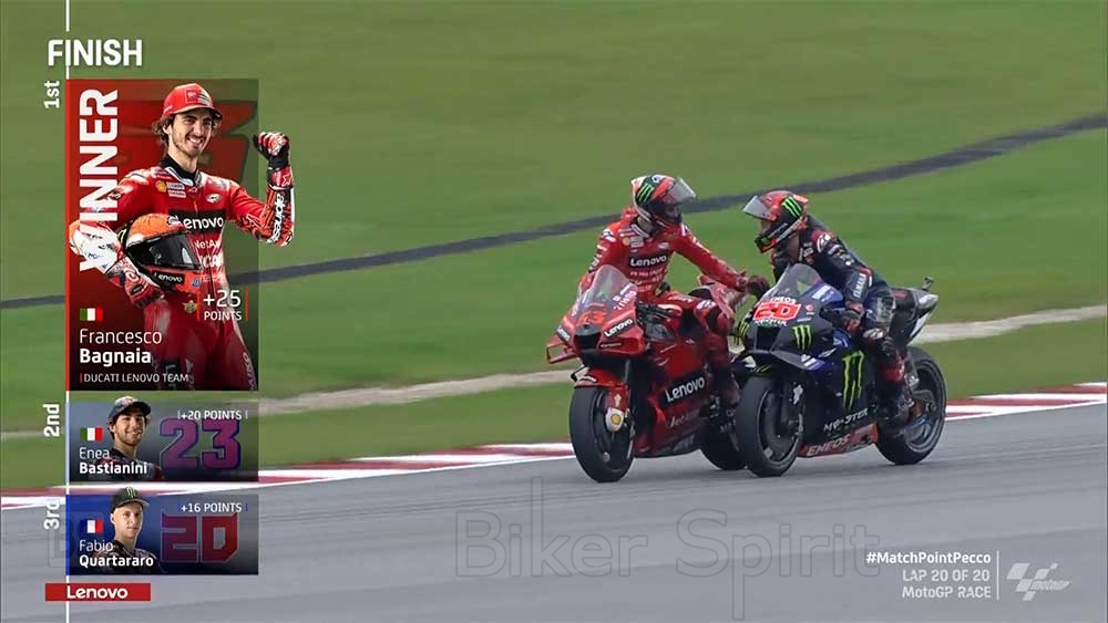 Ο Bagnaia έπρεπε να κρατήσει μακριά τον Enea Bastianini, ο οποίος με την Ducati Gresini πέρασε για λίγο μπροστά στον αγώνα, αλλα τελικά έμεινε στην δεύτερη θέση υπακούοντας στις εντολές της Ducati, με την πινακίδα που βγήκε και έγραφε “Bagnaia”.
